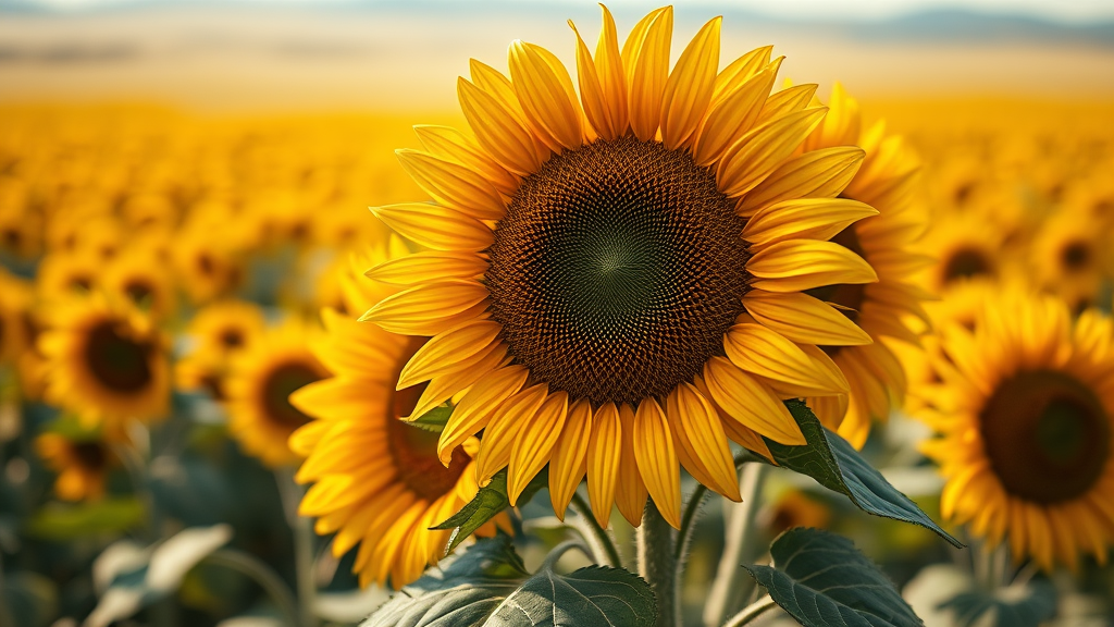 A stunning arrangement of sunflowers, captured with a shallow depth of field, set against the backdrop of a vast, expansive sunflower field. The detailed, hyper-realistic portrait showcases the vibrant colors and intricate textures of the sunflowers, bathed in cinematic lighting that adds a sense of warmth and depth to the scene. The entire composition is masterfully executed, evoking a sense of awe and beauty, as the sunflowers stand in sharp focus against the softly blurred sea of yellow blossoms stretching endlessly into the distance.