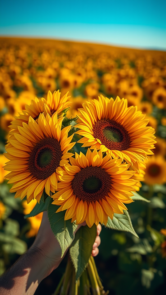 A stunning arrangement of sunflowers held in a bouquet, set against the expansive backdrop of a vast sunflower field. The image captures a shallow depth of field, bringing focus to the intricate details of the petals and textured leaves. The scene is illuminated with cinematic lighting, casting a warm and inviting glow, while the background blurs softly into a sea of golden blooms under a clear blue sky. This hyper-realistic portrait captures the essence of a sunlit masterpiece, where each flower displays vibrant hues and lifelike details, evoking the tranquility and beauty of nature in 8K resolution.