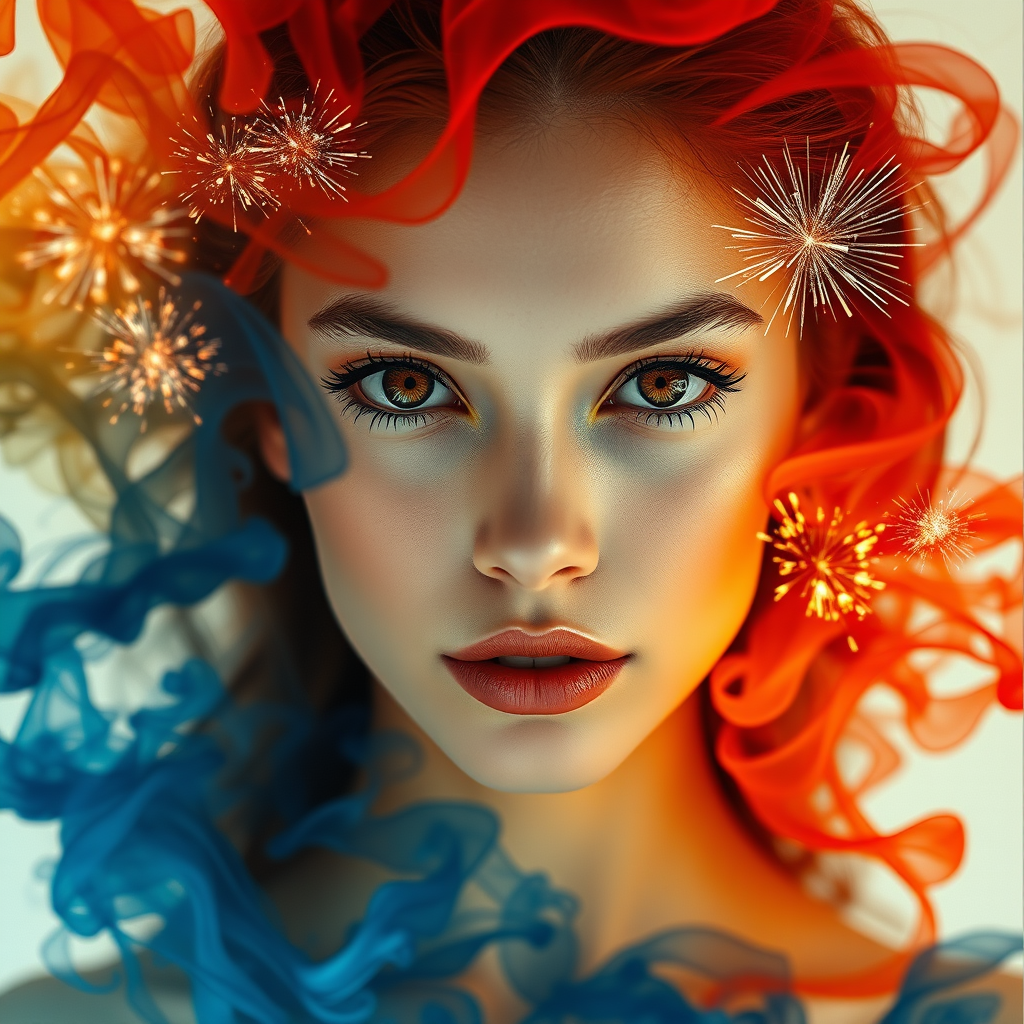 A stunning artistic creation capturing the essence of ultimate beauty, a simple yet profound image showcasing harmonious colors. In a surreal fantasy land, a close-up of a mesmerizing female supermodel with deep, captivating eyes and a flawlessly symmetrical, exquisite face. The backdrop is a dazzling display of smoke-like fireworks bursting into life, resembling ethereal waves of transparent ink ribbons in shades of red, yellow, and blue, against a backdrop of a soft, pure matte canvas. Subtle creative twists enhance the dreamlike quality while maintaining the awe-inspiring core concept.