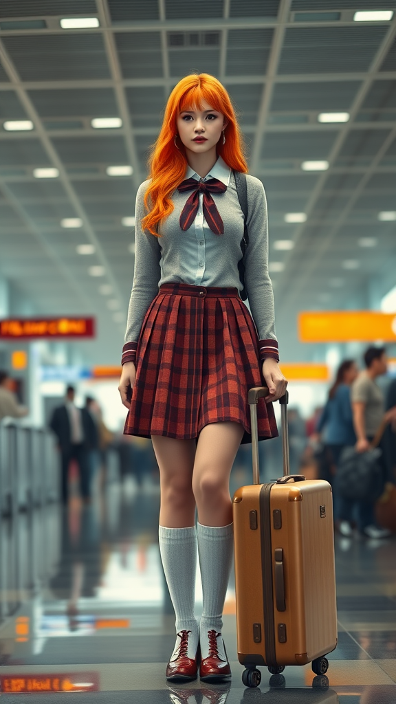 A stunning artwork depicting a vibrant-haired woman with a striking orange hue, donned in an elegantly crafted magical school uniform. Her ensemble includes a classic schoolgirl skirt and high socks, exuding a sense of both tradition and fantasy. She stands confidently, holding a stylish suitcase as if ready to embark on an extraordinary journey. The scene is set in a bustling airport interior, capturing the atmosphere of anticipation. The composition draws inspiration from the rich storytelling of Harriet Powers, merging it with a hyperrealistic digital art style that captures every nuanced detail. The piece is reminiscent of a promotional still from a live-action film, blending realism with a touch of the mythical, making it a piece trending on CG Society, celebrated for its innovation and emotional depth.