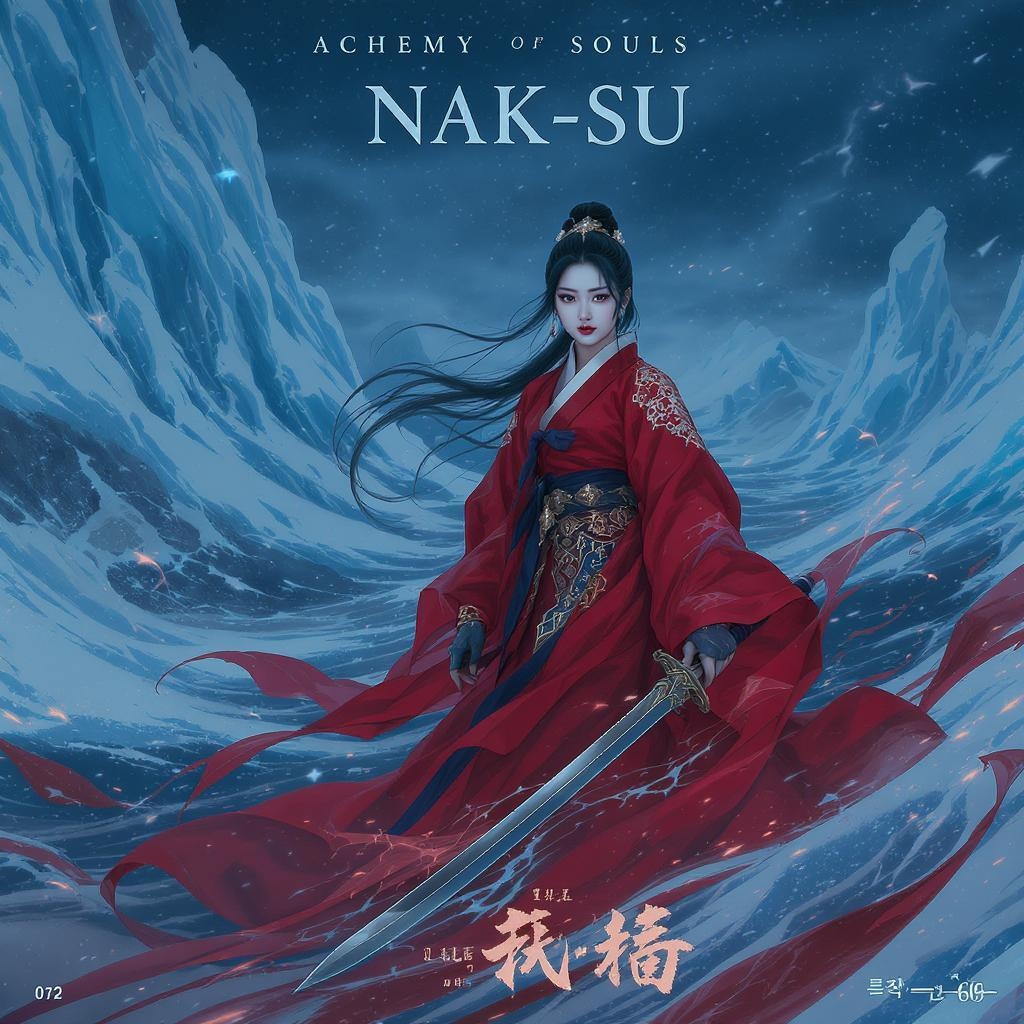 A stunning artwork depicting Nak-Su, the mesmerizing Korean female assassin from Alchemy of Souls, portrayed by Go Yoon Jung. She stands poised with her sword amidst an ice-covered ocean, the vibrant red of her traditional hanbok contrasting against the icy backdrop. Her hair is elegantly tied back, embodying both strength and grace. The scene is captured in a striking palette of deep sky-blue and vivid red, reminiscent of a cinematic movie still from a k-drama historical drama. The atmosphere is enriched with elements of metafiction and snow-draped landscapes, while hints of technological fusion subtly accent the narrative, creating a unique blend of traditional and modern storytelling.