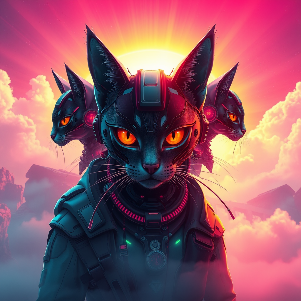 A stunning artwork illustration of a feline hacker in a futuristic cybernetic landscape, featuring a sleek, sharp-faced cat with intricate cyber enhancements. The scene is enveloped in volumetric fog and pierced by dramatic godrays, creating a high-contrast effect. The vibrant, vivid colors and high saturation bring the landscape to life, inspired by the styles of Greg Rutkowski, Jesper Ejsing, Raymond Swanland, and Alena Aenami. The feline figure is depicted with a sense of mystique and intelligence, its multiple heads and bodies suggesting a quantum presence. Showcased on ArtStation, this piece is rendered in a wide-angle, vertical orientation, adding depth and dynamism to the composition.