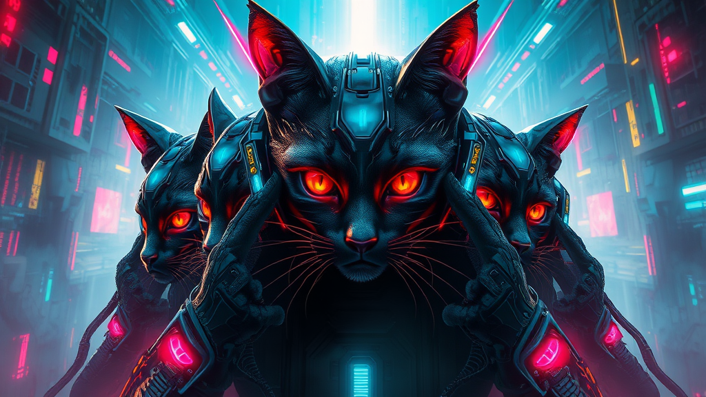 A stunning artwork illustration of a feline hacker set in a futuristic cybernetic landscape, showcasing sharp facial features, enveloped in volumetric fog and illuminated by godrays. The scene is filled with high contrast and vibrant, vivid colors with high saturation, drawing inspiration from the styles of Greg Rutkowski, Jesper Ejsing, Raymond Swanland, and Alena Aenami. The composition is designed for a wide-angle, vertical orientation, depicting a cat-like figure with multiple heads and bodies, capturing the essence of a complex digital world with imaginative elements. This concept would be prominently displayed on an art platform like ArtStation.