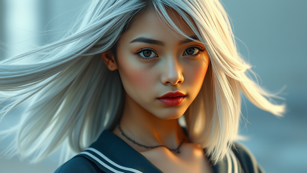 A stunning Asian girl with flowing medium-length white hair and captivating eyes, her olive skin radiating a healthy glow. She has a toned physique accentuated by a schoolgirl outfit that playfully reveals her midriff. Her features are perfectly symmetrical, exuding an air of grace and allure. Captured in a hyperrealistic style with cinematic lighting that enhances every highly detailed aspect of the scene, this breathtaking vision unfolds in 8k UHD, showcasing an innovative twist on classic beauty and style.