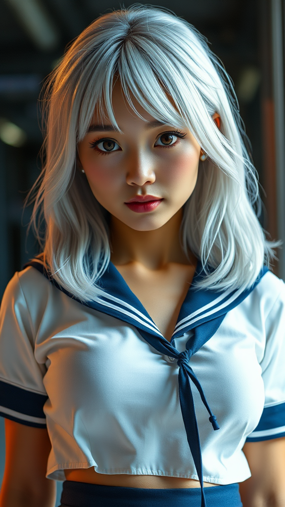 A stunning Asian girl with mesmerizing eyes, her olive skin radiant under the cinematic lighting, medium-length white hair framing her perfect face. She flaunts a toned physique, clad in a schoolgirl uniform that reveals her midriff. Captured in hyperrealistic detail, the breathtaking scene is an 8K UHD masterpiece, presenting an enchanting and captivating vision.