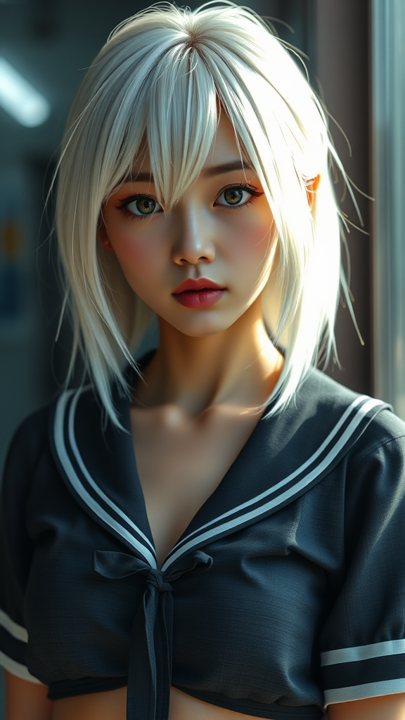 A stunning Asian girl with striking white hair and captivating eyes, her olive skin glows under cinematic lighting. She has a toned physique and wears a school girl uniform that subtly reveals her midriff. Her face is flawless, exuding an air of perfection. The scene is captured in hyperrealism with meticulous detail, resulting in a breathtaking 8k UHD composition, creating a visual masterpiece that's both enchanting and mesmerizing.