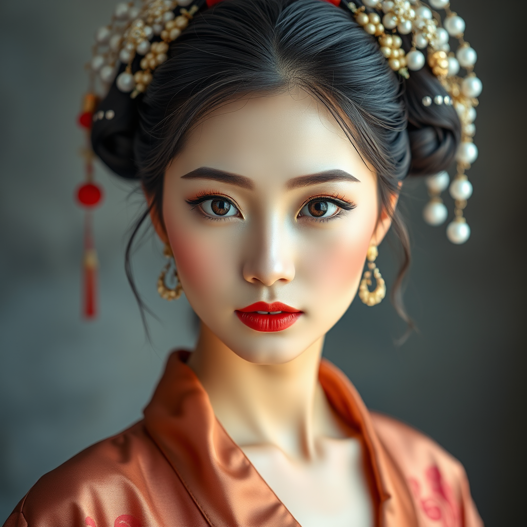 A stunning Asian woman with porcelain-like skin, exuding flawless radiance and an ethereal charm. Her monolid eyes are dark and captivating, with an alluring gaze enhanced by subtle eyeliner. Gently arched eyebrows convey soft emotions, while her lips are delicately tinted like cherries. Dressed in a luxurious silk robe, her look is further enriched by elaborate hairpieces, adding to her mesmerizing presence. Captured in a high-resolution, professional portrait that showcases her enchanting features in 4k detail.