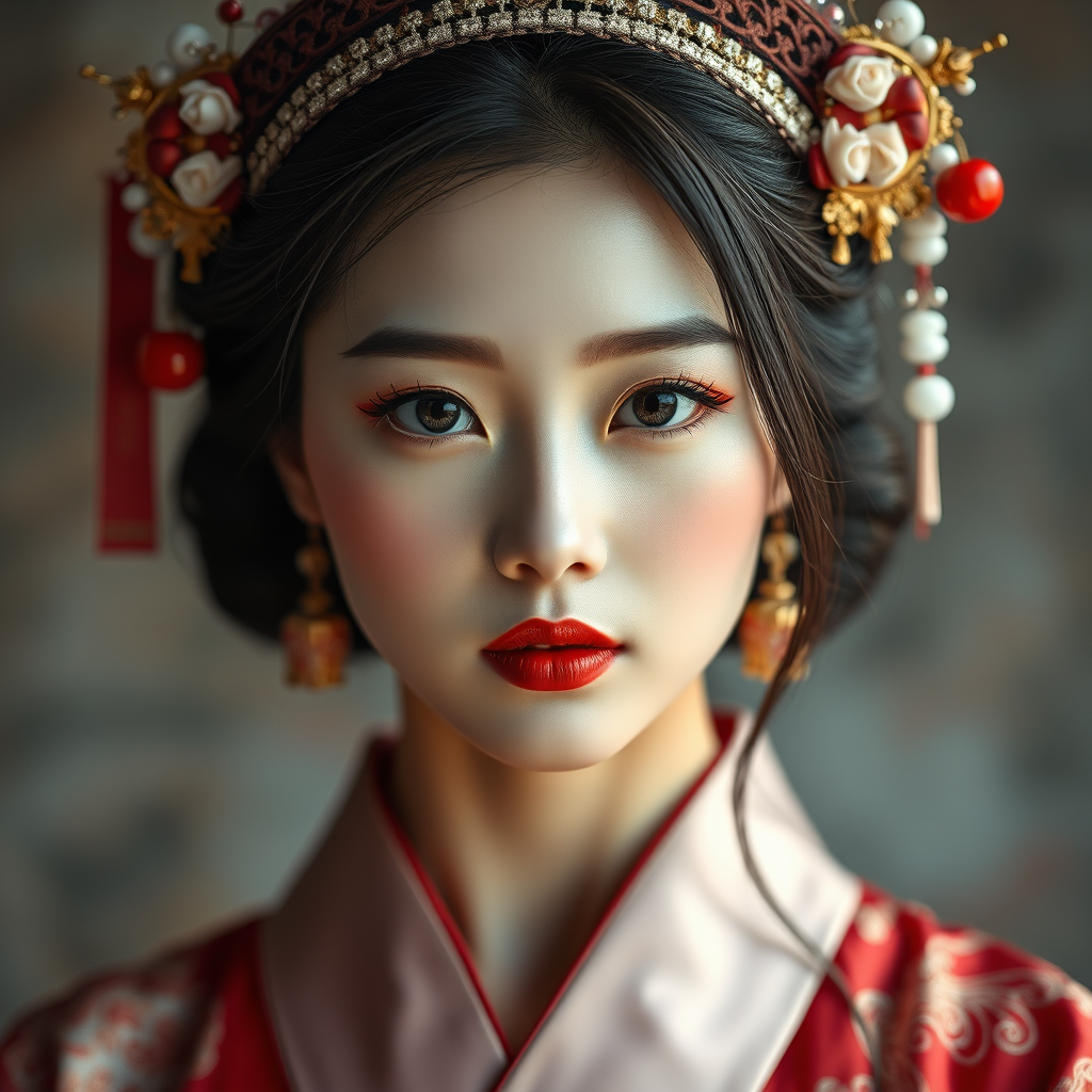 A stunning Asian woman with porcelain skin, radiant and flawless, exudes an ethereal beauty. Her monolid eyes are dark and entrancing, with a gaze that captivates. Delicate eyeliner enhances their allure, while her arched eyebrows convey gentle emotions. Her lips, resembling cherries, are subtly tinted. She is adorned in luxurious silk kimonos and intricate hairpieces that enrich her enchanting appearance. This is a RAW portrait captured with professional photography, in breathtaking high resolution, 4k.