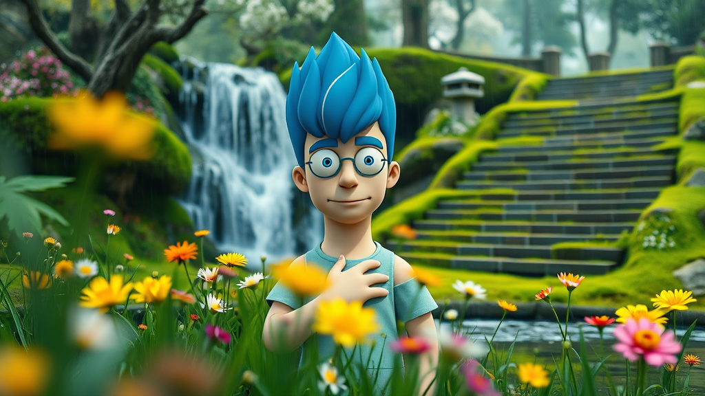 A stunning award-winning hyperrealistic HDR 8K detailed portrait photo of Abraham Simpson as a real human, with blue eyes and blue hair. The composition features a blurry foreground and blush stickers, set in a green-themed outdoor day scene with English text commentary. There's a focus on depth of field with elements like flowers, grass, and a waterfall. Abraham is depicted with a hand on his chest, surrounded by various flowers (yellow, pink, red, and white), and looking at the viewer. The atmosphere includes rain, sunlight, and a lush wetland with trees and a sky backdrop. The portrayal embraces elements like moss, snow, stairs, and water in an environment resembling a traditional media style with realistic virtual YouTuber influences. The scene has a peaceful vibe, with a hint of the ambiguous fantasy connected to fictional universes. While maintaining the hyperrealistic approach, eliminate negative elements like blurriness, disfigurement, and low quality, ensuring a captivating and artistically appealing representation.