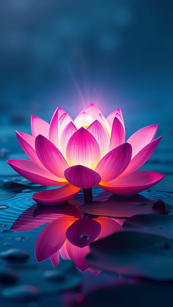 A stunning, award-winning photograph capturing a radiant lotus flower with a mesmerizing bioluminescent glow, its vibrant colors shimmering under soft, ethereal lighting, rendered in ultra-high-definition 8k, exuding a serene beauty that captivates and trends on art platforms worldwide, set amidst a tranquil water landscape with delicate reflections dancing around it.