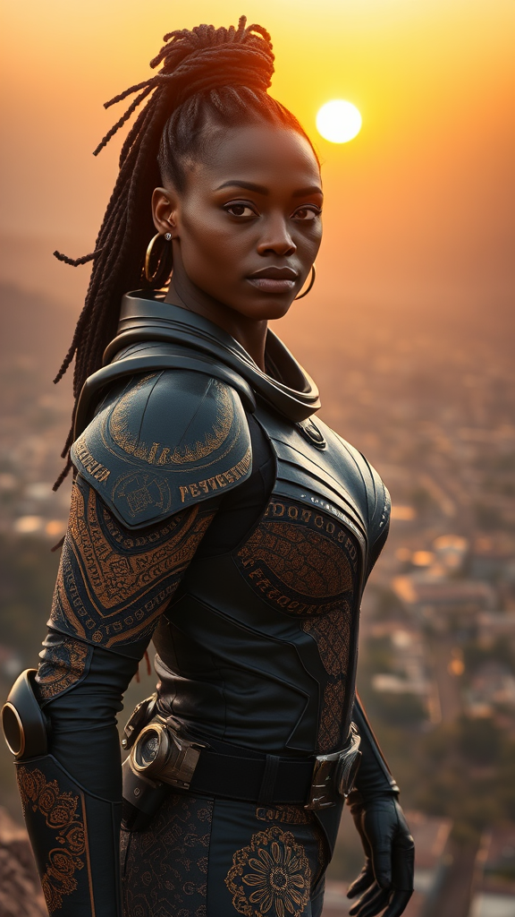 A stunning Bissau-Guinean woman stands as a space captain in the 24th century, gazing confidently at the camera from a hill overlooking the breathtaking landscape of Fouta Djallon. Clad in magnificent Vibranium armor with intricate black and gold kente cloth patterns, she embodies strength and grace after a seven-year mission exploring the galaxy's outer spiral arm. The scene captures her proud homecoming against a backdrop of a city reminiscent of Wakanda, imbued with the spirit of Black Panther. The golden hour sun bathes the scene in a warm glow, accentuating her regal features. The composition evokes an epic yet intimate narrative, blending photorealistic Afro-futurism with cinematic inspiration from Interstellar and visionary direction akin to Ava DuVernay's storytelling.