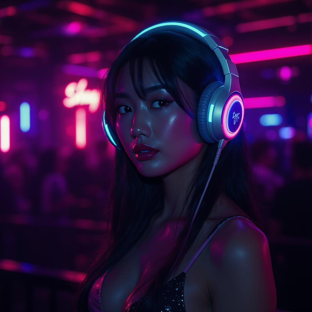 A stunning black-haired Asian woman wearing futuristic headphones illuminated by vibrant pink and blue neon lights in a dimly lit nightclub, high resolution, ultra-realistic photography, captured with a professional cinematic angle, dynamic backlighting casting dramatic shadows.