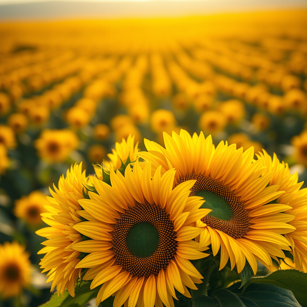 A stunning bouquet of sunflowers captured in a close-up portrait, their vibrant yellows and rich textures showcased against a vast expanse of blurred sunflower fields that stretch infinitely into the horizon. The scene is imbued with cinematic lighting that casts gentle highlights and deep shadows, enhancing the hyper-realistic details. The composition feels like a masterpiece of nature, with warm, golden hues enveloping the lush petals and leaves, underlining the beauty of the sun-drenched landscape in 8K clarity.