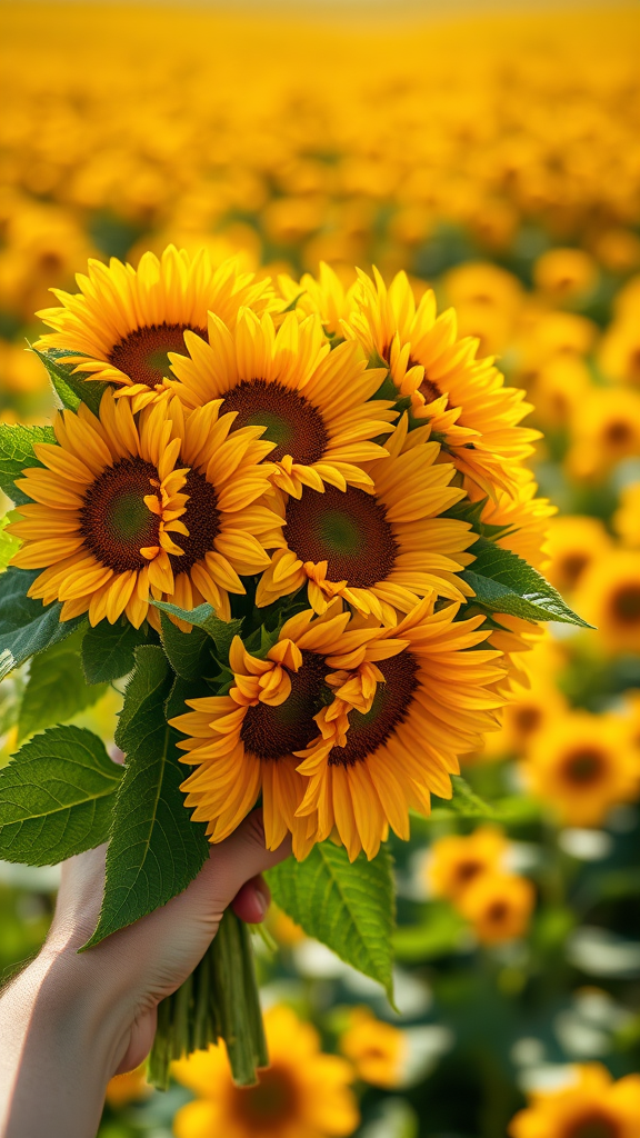 A stunning bouquet of vibrant sunflowers held in the foreground, with the delicate play of cinematic lighting capturing every intricate petal and leaf detail, set against a vast, sprawling field of sunflowers that stretches into the horizon. The shallow depth of field softly blurs the background into a golden sea, while the crisp portrait-like focus on the bouquet creates a hyper-realistic masterpiece that immerses the viewer in the essence of a sunlit afternoon in an endless field of sunflowers.