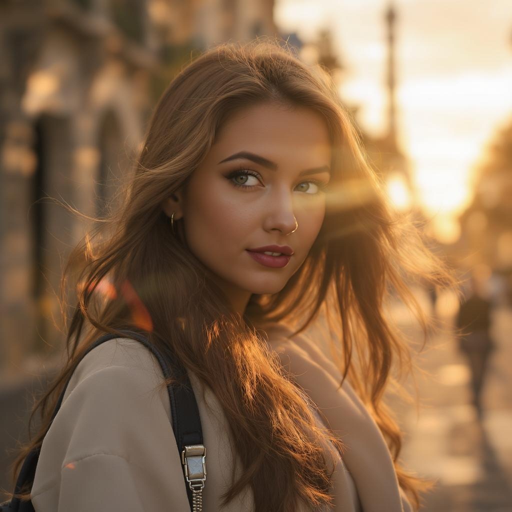 A stunning candid of a charming 24-year-old Russian woman in Paris during sunset, enveloped in radiant light rays. High-resolution image capturing her detailed facial features, with sharp focus and aesthetic appeal. Her clothing and skin showcase ultra-realism with intricate and elegant detail. The intricate detail extends to her eyes, body, and natural skin texture, achieved through octane render and photorealism techniques. Captured using a Sony Alpha 1 with an 85mm lens at f/1.4 GM, the photo features realistic shadows, roughness, and specular lighting, creating a cinematic film still effect. The image is center-framed with a symmetrical composition, providing a fashion model appearance suitable for Instagram. The vibrant setting is complemented by the artistic use of smog and dust, with raytracing enhancing the overall ambiance. No distortions or anatomical anomalies present, ensuring natural proportions and a polished finish.