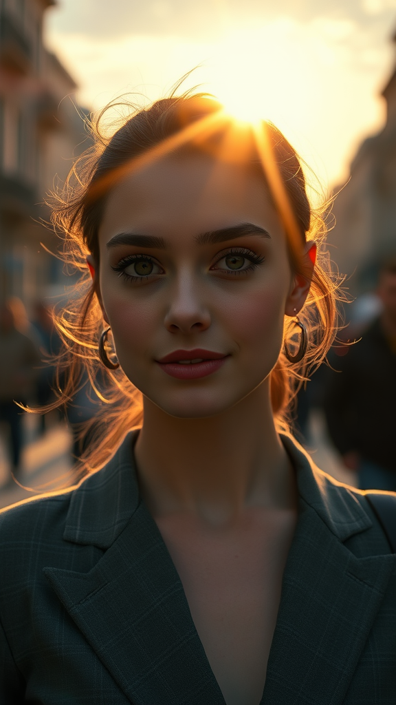 A stunning candid portrait of a charming young woman in Paris during sunset, basking in the radiant light rays. Her high-resolution features are captured with sharp focus and aesthetic detail. The scene showcases her extremely detailed eyes, skin, body, and clothing in an octane-rendered, photorealistic style with realistic shadows and natural skin texture. The image is ultra-realistic, photographed in 8K UHD with intricate elegance and highly detailed sharpness. The soft specks of smog and dust are visible in the air, adding an atmospheric touch enhanced by ray-traced and specular lighting. Taken with a Sony Alpha 1 and an 85mm f/1.4 GM lens, the cinematic still is center-framed with symmetrical precision. The scene maintains its organic sense, avoiding unrealistic elements like extra or malformed limbs, deformities, and other distortions, ensuring a beautiful, natural depiction without watermarks or distracting elements.