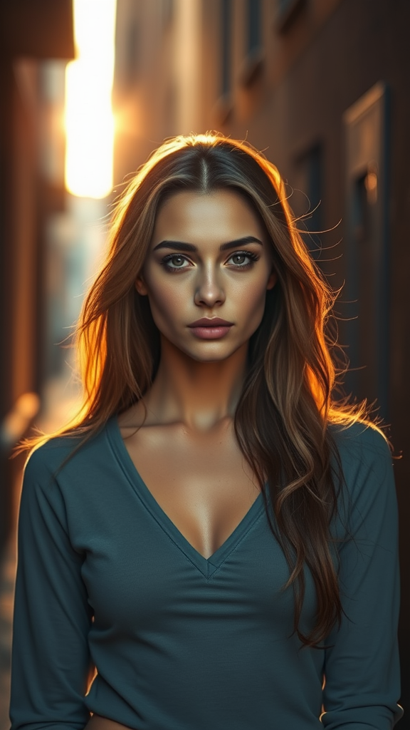 A stunning candid shot of a 24-year-old Russian woman standing in an alleyway during sunset, with radiant light casting a warm glow. Captured in high resolution, her detailed facial features and striking eyes are in sharp focus. Her natural skin texture and clothes are exceptionally detailed, rendered with photorealism that captures every nuance of real life. With a toned physique and elegant posture, she appears almost cinematic, set against a backdrop of subtle smog and dust that add depth. The scene is brought to life with specular lighting and a shallow depth of field, photographed with a Sony Alpha 1 and an 85mm lens at f/1.4. The composition is center-framed and symmetrical, enhancing her aesthetic appeal reminiscent of a fashion model seen on Instagram. The image is free from imperfections or distortions, ensuring a pure depiction of beauty without any added elements like text or watermarks.