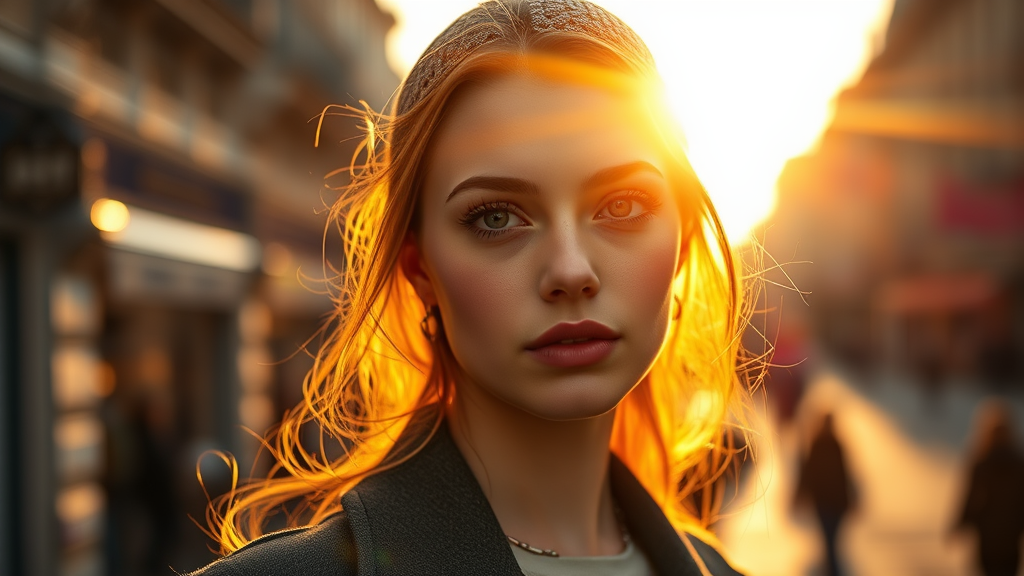 A stunning candid shot of a charming young 24-year-old Russian woman in Paris at sunset, enveloped in radiant light rays. The image boasts high-resolution, capturing detailed facial features, sharp focus, aesthetic beauty, and intricately detailed eyes and skin. Her attire, skin texture, and physique are depicted with ultra-realistic detail, emphasizing photorealism with natural shadows and smooth textures in a cinematic style. The scene is rendered with a shallow depth of field, photographed using a Sony Alpha 1 with an 85mm f/1.4 lens, ensuring precise focus. The composition is center-framed and symmetrical, reminiscent of a fashion model photoshoot, blending elegance and high detail, while maintaining the vibrant atmosphere of Paris at twilight. The image excludes any elements like extra limbs, disfigurements, or other distortions, focusing on a perfect portrayal of beauty without any intrusive artifacts or distractions.