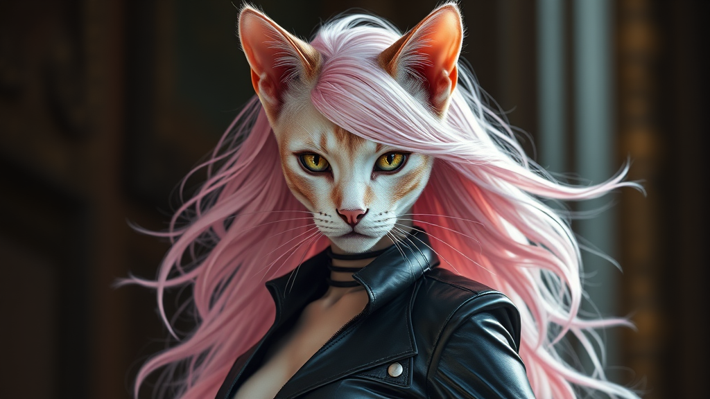 A stunning cat-human hybrid with enchanting light pink hair, adorned in a sleek black leather ensemble that accentuates her graceful movements, her eyes glimmer with intelligence and mystery as she embodies a blend of elegance and allure.