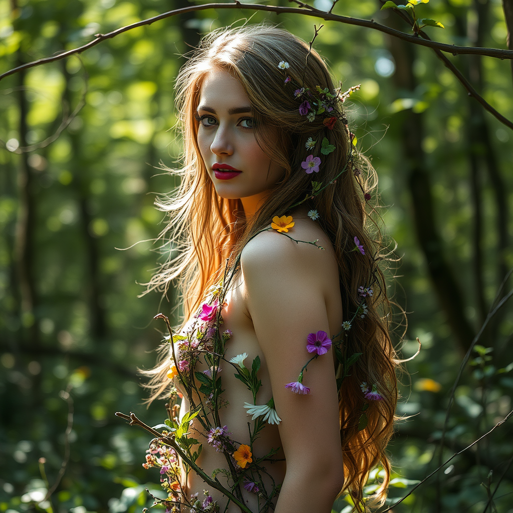 A stunning Caucasian woman gracefully emerges from the depths of the forest, her presence ethereal and enchanting. Her skin glows softly under the dappled sunlight filtering through the canopy above. Wildflowers of every hue are interwoven with delicate branches, wrapping around her body like a natural tapestry of vibrant petals and verdant twigs. Her hair cascades down her back, intermingled with tiny blooms and fresh leaves, as if the forest itself has adorned her with its beauty. With every step, the forest seems to come alive, leaves rustling as if whispering secrets, while the air is infused with the fragrance of blooming flora and damp earth. This mysterious muse exudes a harmonious connection with nature, embodying the untamed elegance of the woodland realm.