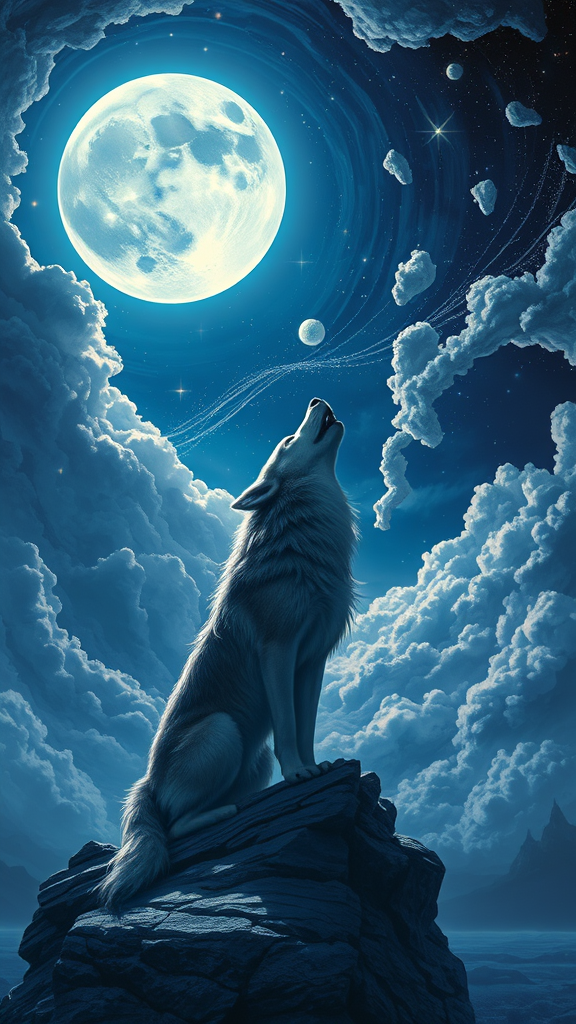 A stunning, celestial scene of a wolf howling under a mesmerizing, magical moonlit sky, rendered in exquisite 8k detail reminiscent of the styles of Don Maitz, Todd McFarlane, and Mary Blair, capturing an ethereal and breathtaking beauty with intricate, blink-and-you-miss-it nuances throughout a landscape alive with enchantment and mystery amidst swirling clouds and twinkling stars, painted with elements of chaos and wonder.
