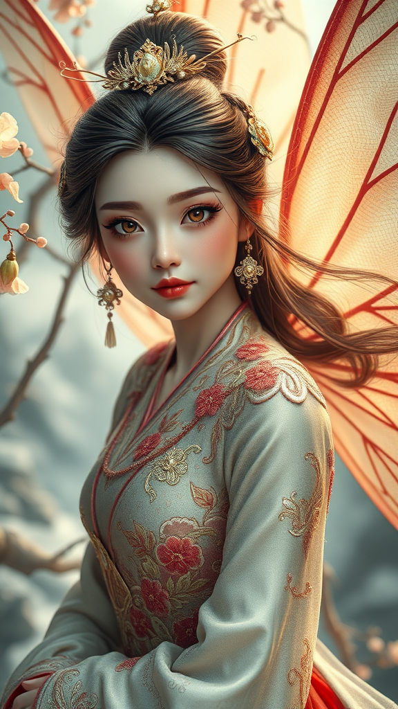 A stunning Chinese fairy character with intricately detailed features, showcasing clear skin pores and lifelike textures. Her ethereal presence is enhanced by a lavish and beautifully crafted gown, adorned with delicate embroidery that shimmers in the light. Her eyes are bright and expressive, reflecting an ancient wisdom, while her flowing hair seems to dance with an invisible breeze. Her surroundings are a blend of mystical landscapes and serene nature, creating a harmonious backdrop that accentuates her otherworldly grace.