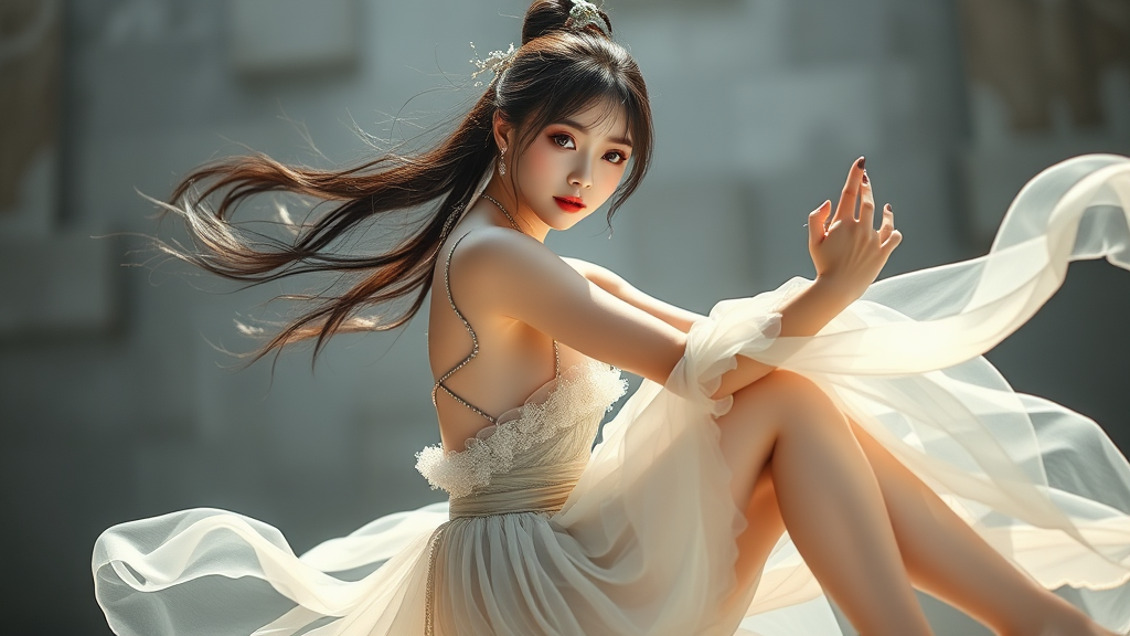 A stunning Chinese woman with ethereal features, possessing large silver eyes and porcelain skin, clad in a flowing gauze skirt that highlights her slender legs. Her presence is amplified by high brightness and a shimmering pearlescent glow, captured in high-quality detail. She strikes dynamic poses and angles, exuding an air of mystery infused with elements of fantasy and magic, her figure emitting a subtle, enchanting shine.