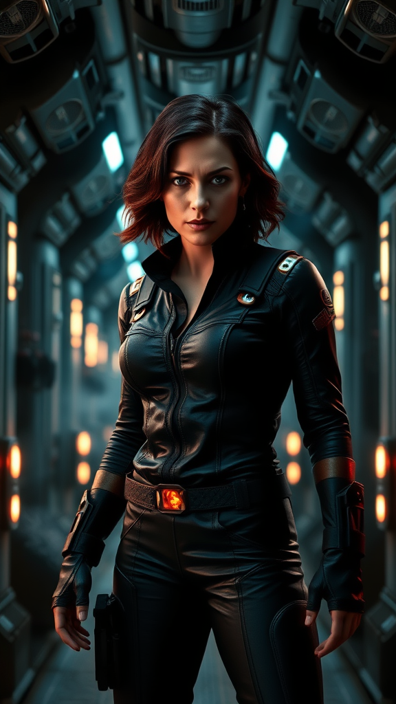 A stunning cinematic 8k wallpaper of Ellen Ripley, rendered with a hyper-realistic octane engine, showcasing her in a powerful and determined stance in a dimly lit futuristic corridor, enhanced with intense shadows and vivid colors, detailed textures highlighting her iconic jumpsuit and expressive features, ambient light reflecting off metallic surfaces, atmospheric elements like swirling mist adding depth, capturing the essence of a sci-fi heroine facing the unknown with unwavering resolve.