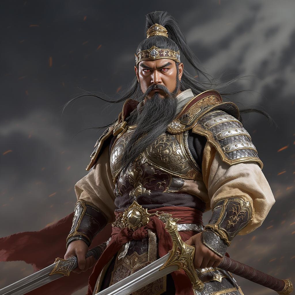 A stunning cinematic action still shot capturing Guan Yu, a prominent Chinese general from the Three Kingdoms period. He stands confidently, embodying strength and leadership as a middle-aged male figure. Dressed in intricate and majestic armor, Guan Yu’s characteristic long beard and phoenix eyes are strikingly portrayed. He firmly grasps his weapon, exuding authority and readiness for battle. This 3D model is brought to life through photorealistic rendering powered by Unreal Engine, reminiscent of a high-quality video game. The attention to detail in the image offers an exquisite visual experience, akin to a masterpiece captured on a DSLR camera, while maintaining clean and precise anatomy with all features in proportion and accurately represented.