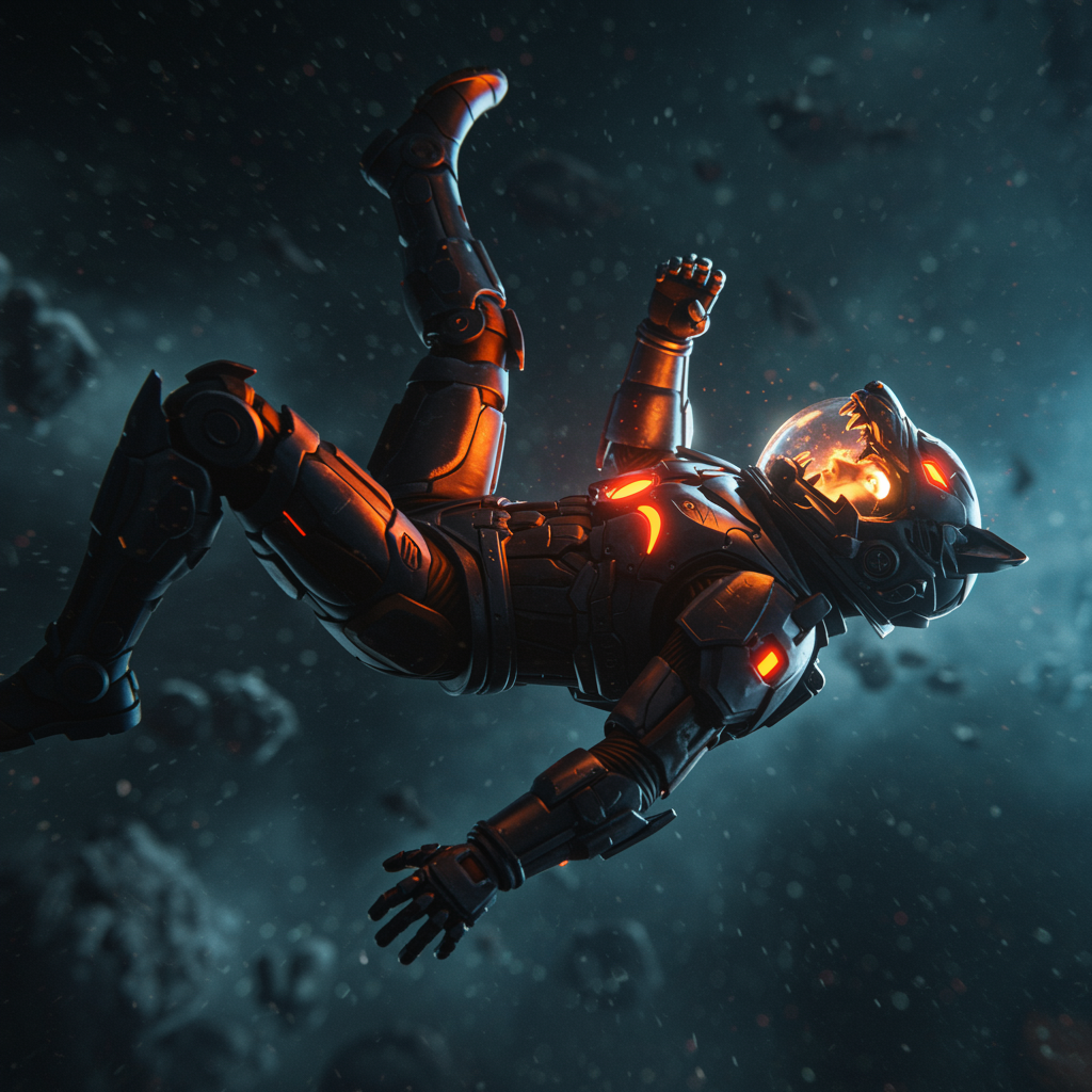 A stunning cinematic film still capturing a professional 3D model anime artwork concept art, reminiscent of a masterpiece oil painting and comic Dreamscape. It features a futuristic pilot clad in an intricate sci-fi anime-inspired space suit, falling backwards into the endless cosmos. The scene is surreal, ethereal, and dreamy, exuding mystery and fantasy. The artwork is exceptionally detailed, with a psychedelic vibrancy and painterly quality, akin to a matte painting. The pilot's expression reveals panic and fear as he descends. The key visual, rendered with Octane, boasts dramatic volumetric lighting, glossy lens flare effects, and a shiny surface. The space suit, with its reactor core, is heavily armored in a striking black and fire orange color scheme, incorporating a menacing wolf-themed helmet seemingly ablaze with cosmic fire. The shallow depth of field and vignette effect enhance the scene's high budget feel, accentuating its epic, moody, and gorgeous aesthetics. Film grain adds texture, while the grainy cinemascope and bokeh elevate the visual experience to an extraordinary level.