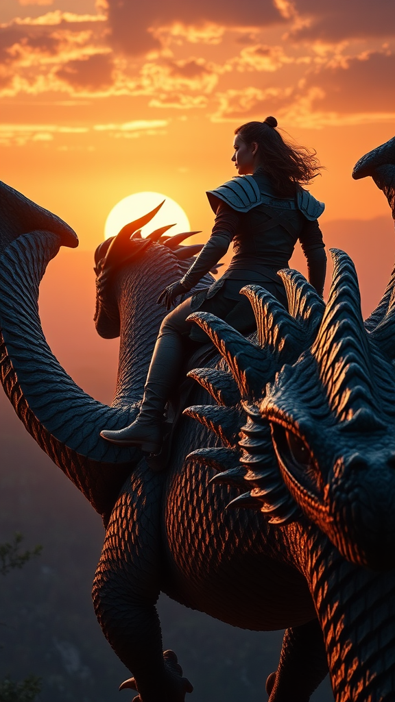 A stunning cinematic portrayal of a lone adventurer, a young woman, riding majestically on the back of an enormous, mythical dragon. Set against a breathtaking fantasy backdrop, the image captures the essence of an epic journey, with extremely detailed textures highlighted in high definition. The dragon's scales glisten under the light of a majestic sunset, casting fiery hues across the sky. The adventurer, donned in intricate armor, grips the reins with unwavering confidence, her eyes scanning the horizon for new adventures. This masterpiece, reminiscent of an award-winning fantasy epic, combines the best quality and astounding detail, delivering an immersive visual narrative in stunning 64K resolution.