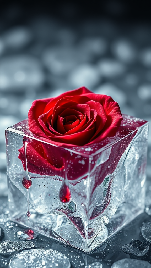 A stunning close-up captures a vibrant red rose emerging triumphantly through a cube of ice, the fractured surface glistening with frosty hues. Delicate blood-red droplets fall from the petals, illustrating the rose's yearning for warmth. The ice beneath begins to melt, creating a sense of transformation and rebirth. Evoking Valentine’s Day sentiments, the scene is rendered in sharp focus with intricate details, basked in dramatic cinematic lighting that highlights the contrast between the icy exterior and the rose's passionate color.