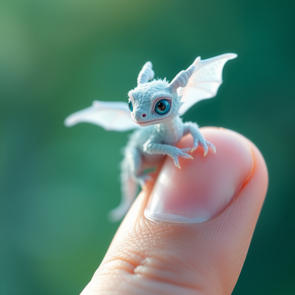 A stunning close-up image captures a delicate, finger-sized dragon perched on a woman's fingertip. Its body is adorned with soft, light blue and white furry scales that shimmer in the light. The dragon's gentle eyes are a bright sapphire blue, and its tiny wings, barely the width of a human finger, glimmer with a translucent glow. Its snout is small and inquisitive, with tiny, wispy tendrils protruding like whiskers. The gentle curves of its petite claws rest harmlessly on the skin, creating a mesmerizing contrast between the ethereal creature and the warmth of human flesh. The scene is set against a soft-focus background of blurred greens and blues, hinting at a lush, distant forest.