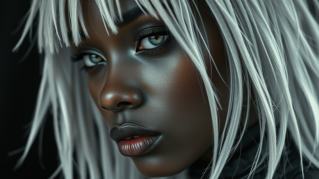 A stunning close-up of a beautiful rasta girl with striking white hair, blending elements of steampunk and cyberpunk aesthetics. The scene captures a cyborg-inspired look, illuminated by mesmerizing volumetric lighting, all detailed with the finesse of high-quality real-life photography. The imagery exudes a low contrast feel, reminiscent of Kodak Portra 400 film, rendered in breathtaking 8k resolution. Visual elements draw from abstract art, surrealist painting, and conceptual graphics, maintaining a vibrant collage of styles with touches of 3D and cartoon-inspired details. The composition weaves in a touch of the avant-garde, exploring themes of nudity and contrast in elegant black and white.
