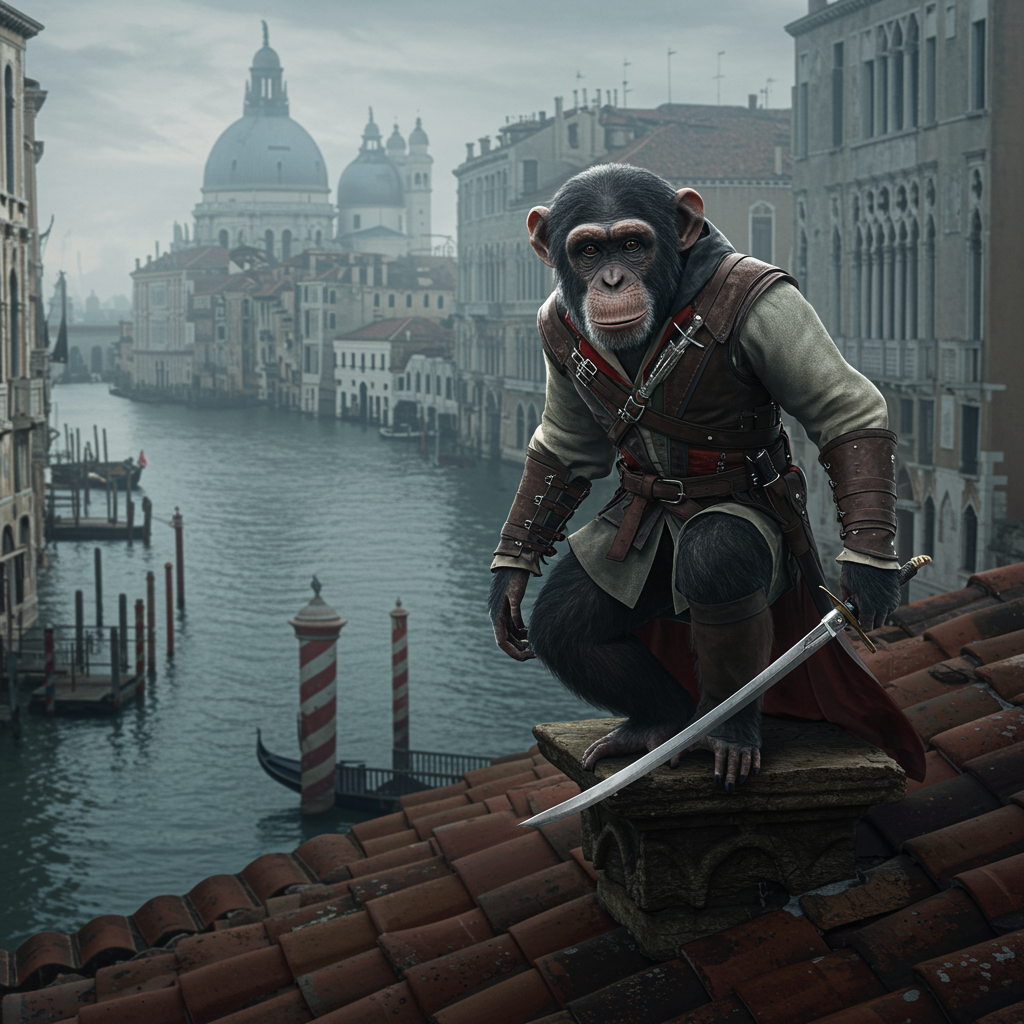A stunning close-up of a chimpanzee dressed as a stealthy assassin, perched on a rooftop overlooking the intricate waterways and historic architecture of ancient Venice. The scene is infused with dramatic volumetric lighting and a misty atmosphere that adds depth and mystery. The composition is centered, showcasing intricate details and breathtaking beauty with precise linework and vibrant colors. The cinematic quality brings the scene to life, capturing the essence of a mysterious tale inspired by Stefan Gesell's striking style.