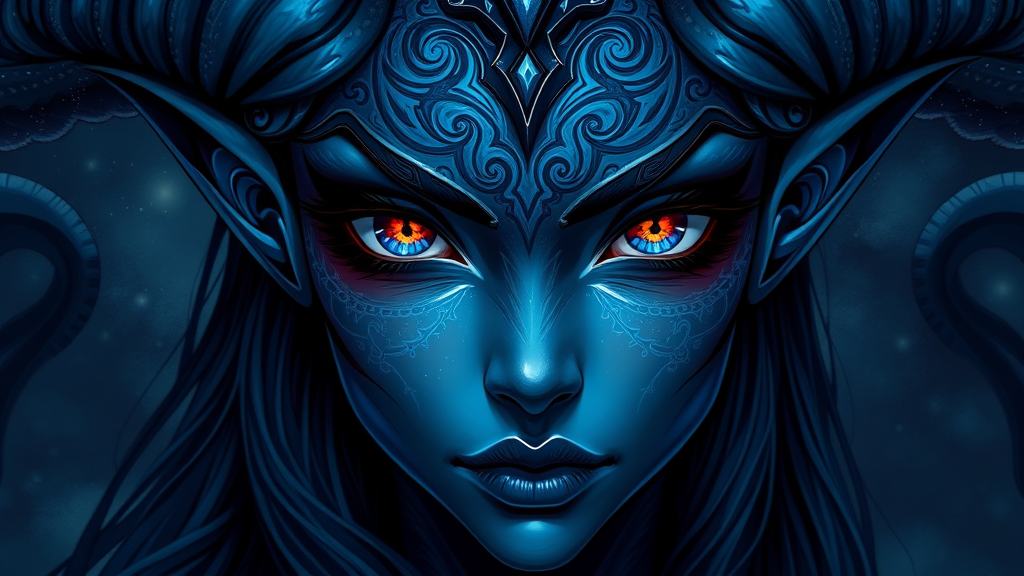 A stunning close-up of a female tiefling with a captivating demon face, her skin a deep cosmic blue adorned with intricate patterns reminiscent of a celestial night. Her lush, ornately twisted horns sweep back elegantly, framing her striking features. The character embodies a blend of mysticism and strength, with vibrant, otherworldly eyes that glow with enigmatic allure. Her expression is both fierce and enchanting, capturing the essence of a demon-girl from a legendary realm. Painted in a style reminiscent of Arcane, the portrait blends anime influences with rich painterly textures, highlighting the duality and grace of this cosmic tiefling inspired by Dungeons & Dragons lore.