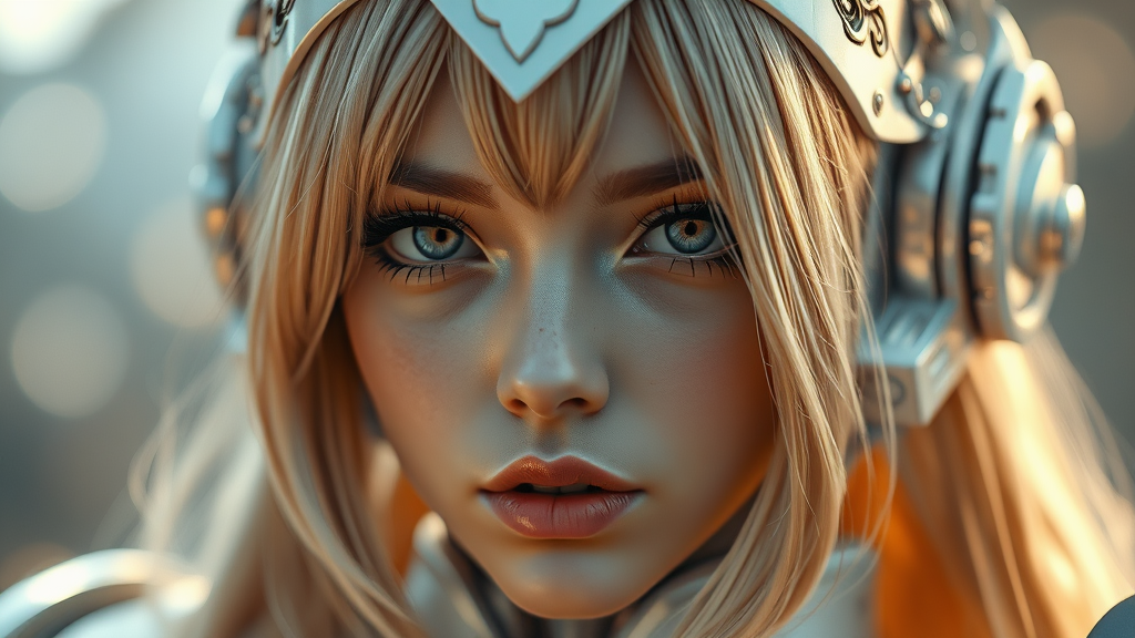 A stunning close-up of a mesmerizing mecha girl featuring sandy-blonde hair with dark tips cascading around her angelic face. Her captivating, seductive eyes and delicately pouty lips are framed by intricate silver-white armor. The ensemble is completed with elegant head accessories that enhance her ethereal presence. Set against a softly glowing backdrop, the scene is enhanced by HDR quality and ultra-high detail. A bokeh effect adds a gentle blur to the background, while cinematic lighting highlights her features with a radiant illumination. The depth of field emphasizes her photorealistic expression, resembling a concept art piece enhanced by Unreal Engine 5 and RTX technologies. The scene captures an artistic composition with breathtaking clarity, accentuating the mecha girl's sophisticated design and missing limb detailing. Subtle modifications in the visual elements add uniqueness while preserving the essence of the original concept.