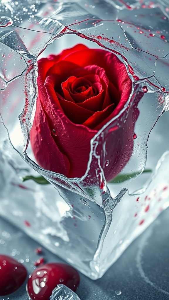 A stunning close-up of a vibrant crimson rose emerging through a translucent cube of ice, its petals adorned with droplets resembling blood, creating a striking contrast against the splintered, frosty surface. The ice bears cracks, with rivulets of water hinting at its gradual melting. Bathed in dramatic, cinematic light, this scene exudes a Valentine’s Day ambiance, captured in sharp focus to highlight the intricate details of the rose and its icy encasement.