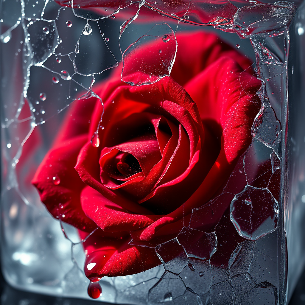 A stunning close-up of a vibrant crimson rose piercing through a translucent ice cube, with fractured patterns adorning the frosted surface. Delicate droplets of blood trickle from the petals, converging with the glistening meltwater. The scene is imbued with a romantic allure, bathed in dramatic light that accentuates the intricate textures. A cinematic atmosphere envelops the composition, capturing a sense of timeless passion, perfect for a Valentine’s Day motif.