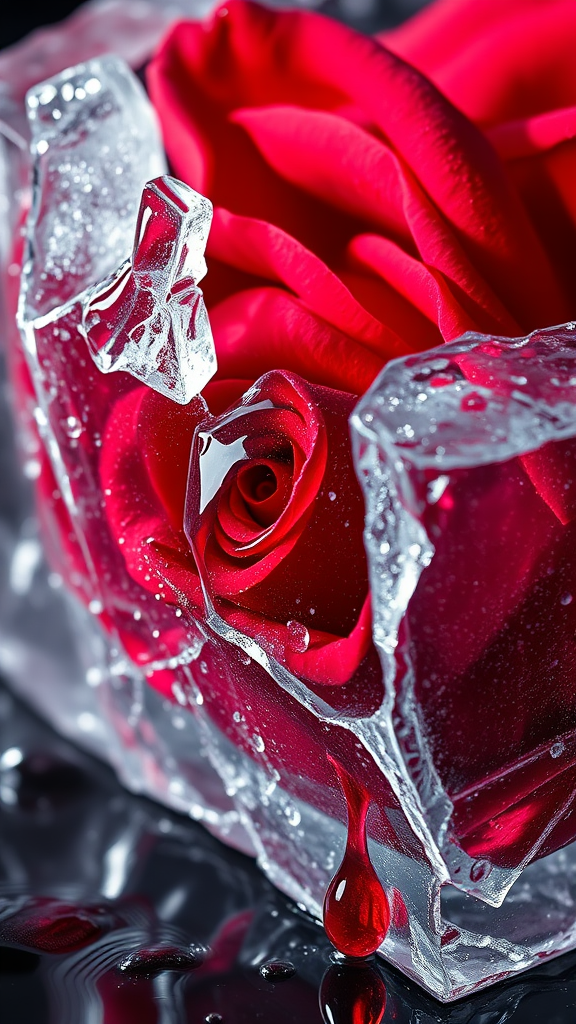 A stunning close-up of a vibrant red rose emerging through a jagged ice cube, the shattered ice revealing frosty colors beneath. Drops of deep red liquid trickle from the petals, giving a sense of intensity, as the ice slowly melts, casting reflections. The scene exudes a Valentine’s Day ambiance, with dramatic cinematic lighting highlighting the intricate details, creating a sharp and powerful visual impact.