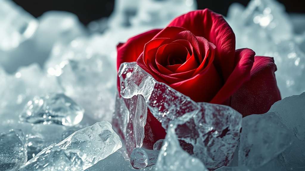 A stunning close-up of a vibrant red rose emerging triumphantly through the fractured surface of an icy cube, shards of crystal-clear ice scattered around. Frosted hues cast a delicate contrast against the deep crimson petals, from which droplets of blood seem to fall, mingling with the slowly melting ice. The scene evokes a powerful Valentine's Day ambiance, bathed in dramatic, cinematic lighting that highlights the intricate details and sharp focus, creating an intense and emotional visual narrative.
