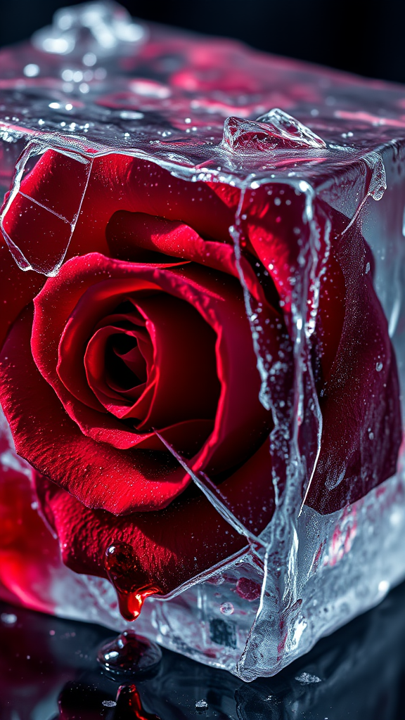 A stunning close-up of a vibrant red rose pushing through the confines of a translucent ice cube, its delicate petals piercing the fragmented and splintered surface, surrounded by frosty hues. Deep red droplets cascade from the rose, staining the melting ice that glistens under dramatic, cinematic lighting. Capturing the essence of Valentine's Day with a sharp focus on the intricate details, the scene is both intense and evocative, blending the fragile beauty of the rose with the stark, crystalline texture of the ice.