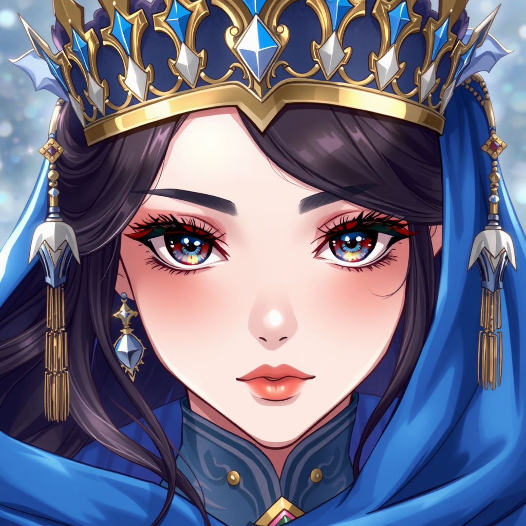 A stunning close-up of a woman with an elegant blue gown and a majestic crown, styled in detailed digital anime art reminiscent of a fantasy world. Her regal presence echoes the essence of a celestial knight, drawing inspiration from legendary characters, with delicate features akin to a princess. The intricately designed portrait showcases her with ethereal beauty and exquisite detail, embodying a heroine from a mythical realm. Her expressive eyes convey strength and grace, reminiscent of an iconic fantasy warrior. The art is characterized by a clean, highly detailed anime style, capturing a perfect blend of majestic elegance and adventurous spirit. The illustration is a harmonious fusion of fantasy elements and meticulously crafted anime character design, evoking the awe-inspired feel of an epic adventure.