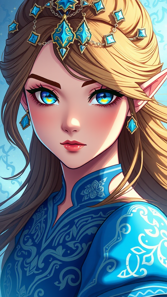 A stunning close-up of a young woman wearing an elegant blue dress adorned with intricate patterns, her head crowned with a delicate tiara that shimmers like stars. The art style is a vibrant digital anime illustration, reminiscent of classic fantasy animation. Her eyes, bright and full of wisdom, reflect the spirit of a warrior princess, similar to the iconic images of Zelda from "Breath of the Wild." Her hair flows gracefully, adding to her regal appearance. The background hints at a mystical realm, with subtle nods to the heroic and mythical aura of the Knights of the Zodiac. An air of strength and grace surrounds her, captured in this highly detailed and exquisite piece of fanart, evoking an intricate blend of fantasy and heroism.