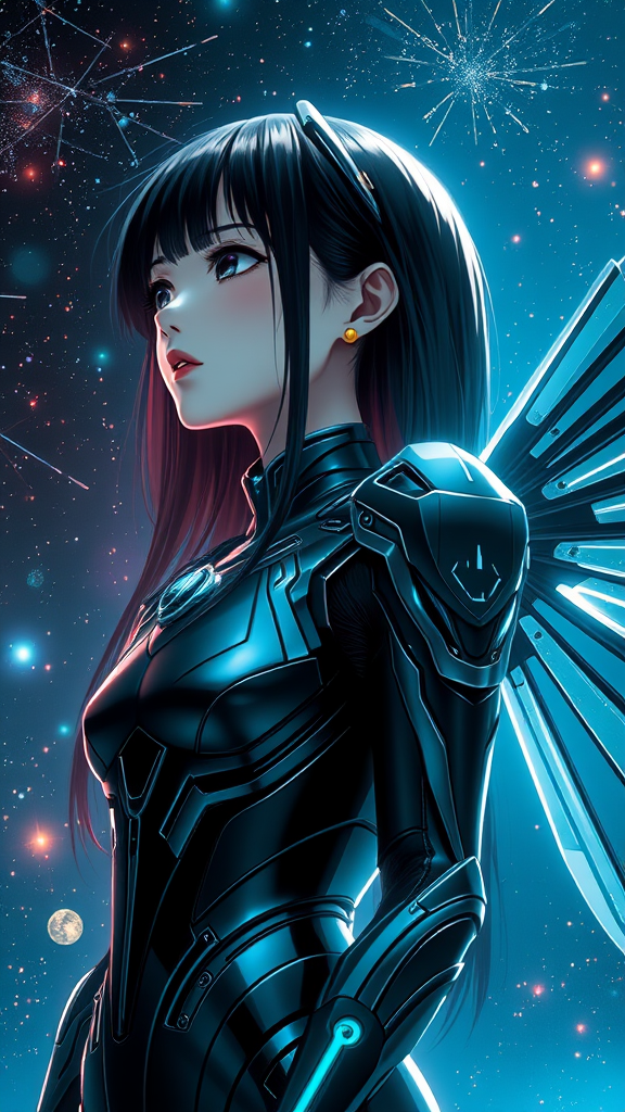 A stunning close-up portrait of a beautiful girl in a sleek Sci-fi exosuit, her dreamy face framed by long black hair. Her slender form stands poised, gazing into the distance. She's clad in a glossy, intricately detailed black and silver insectoid Sci-fi mech, complete with Sci-fi wings, radiating futuristic flair. Inspired by the visionary styles of Tsutomu Nihei and Akira, she's illuminated by bright quasar light in the vastness of outer space, creating a dramatic yet mesmerizing backdrop. The scene is enriched with volumetric graphics, capturing a seamless fusion of anime art and manga drawing. The starry galaxy unfolds around her, interspersed with vibrant plasma beams, all rendered in hyper-realistic 8k UHD, showcasing complex lighting and dynamic effects that elevate the futuristic narrative.