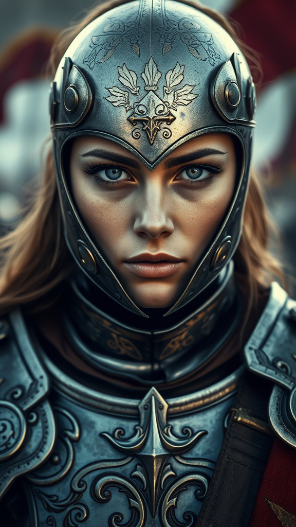 A stunning close-up portrait of a female Knights Templar on a crusade, centered and deeply detailed, showcasing breathtaking beauty with a cinematic quality reminiscent of Karol Bak's artistry. Her armor gleams with intricate designs, and her expression reflects strength and determination. The background hints at a historical setting, emphasizing her resolute stance and noble purpose. The artwork captures the essence of her mission while subtly enhancing the medieval atmosphere and her captivating presence.