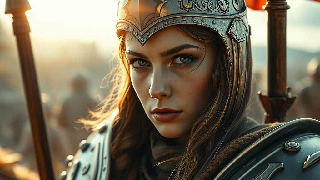 A stunning close-up portrait of a female Knights Templar on a crusade, showcasing breathtaking beauty and intricate detail. The composition is cinematic and reminiscent of Karol Bak's style. Her armor gleams under the sun, highlighting her determined expression and elegant features. The background suggests an epic landscape, immersing the viewer in the era of the Crusades. Her presence is majestic and commanding, reflecting the courage and resolve of a warrior on a sacred mission.