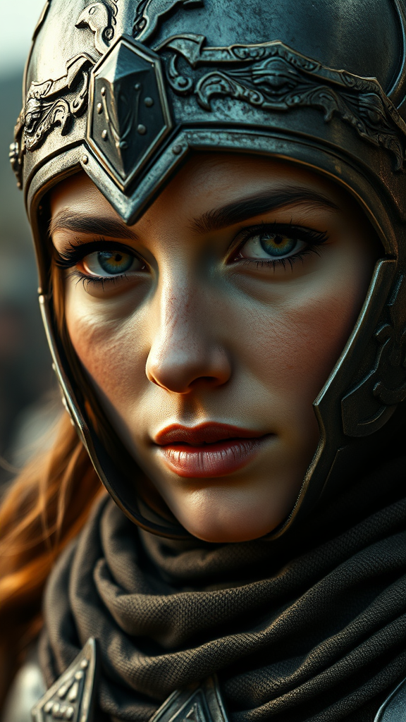 A stunning close-up portrait of a female Knights Templar on a crusade, showcasing her breathtaking beauty and detailed armor. Captured in a comprehensive cinematic style reminiscent of Karol Bak’s work, her expression exudes determination and grace, framed by the intricate design of her helmet. The background subtly hints at the vast landscapes of her journey, enhancing the epic feel without overpowering the central focus. Her eyes reflect stories of bravery and resilience, making this portrayal both powerful and intricate. The artwork is meticulously crafted to avoid common artistic pitfalls, ensuring an engaging and flawless visual experience.
