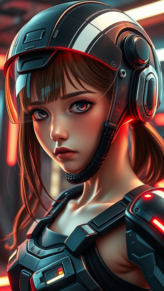 A stunning close-up portrait of a girl with an innocent, frowning expression and a slender athletic build, captured in a dynamic action pose. She is wearing an advanced combat exo-armor suit featuring a closed breathing system and a compact, sci-fi helmet with a high-tech glossy visor. The helmet is illuminated in a cinematic style. The setting is a detailed, photorealistic interior reminiscent of the TV show The Expanse, enhanced by vibrant neon and volumetric lighting. Shot with a Canon EOS 5D Mark IV DSLR at an aperture of f/8, a shutter speed of 1/250 sec, and ISO 100, the scene exhibits exceptional depth of field and hyper-realism. Natural reflections accentuate textures, and the lighting highlights a flowing hair tail, a bare neck, and subtle details like tinted glass. The character's physique is slender with narrow hips, depicted in an anime-inspired style with striking bright light effects and symmetrical design elements. Avoiding any imperfections such as deformed or extra limbs, the composition maintains perfect anatomical proportions for a flawless, captivating visual.