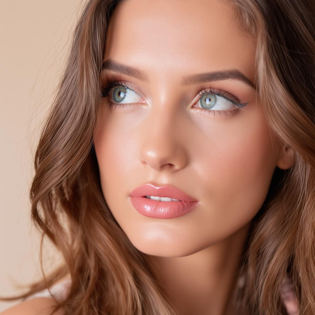 A stunning close-up portrait of a serene woman gazing to the left, her luminous eyes capturing the viewer's attention with exceptional clarity and contrast against a soft, understated background. Her skin appears impeccably smooth, enhancing the overall elegance of the composition. The photograph takes full advantage of an 85mm lens with ISO 400, expertly focusing on the unique details of her face. The time value is meticulously set at 1/500 and the focal aperture is f/1.8, creating a sharp, realistic image that highlights her eyes and flowing hair with a beautifully narrow depth of field. The image radiates a vibrant palette that accentuates her eye color, crafted to achieve an award-winning, lifelike capture.